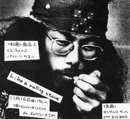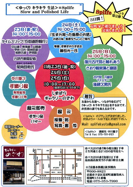 <プロフィール> 露天商♪心詩(ろてんしょうしんじ) 関西の路上やライブハウスを中心にギター一本抱えて歌うおっさん。 歌う曲は清志郎やBeatles等昔のロックンロールが中心。 よく弦が切れるがきにしない。 ♪やってられない〜はずない やってやれないことない・・・ http://d.hatena.ne.jp/video/ameba/3057775 怖がることはない、気のいいおっさんである。 ダンシング義隆 1970年代後半に関西を中心に大ブレイクしたバンド! 「誰がカバやねんロックンロールショー」 のヴォーカリスト 11月 ----------------------------------------------------------------------- 11/23(金)〜25(日) 10:00〜17:00(最終日は16:00) ●SPlife文化祭 講演会と手作り品の展示即売を行います。 *SPlifeはslow&polished Lifeからの造語で 友達から友達へ繋がりを広げて「ゆっくりキラキラ生活」をする会です。 非営利の誰でも集える会です。 【日替わり講演会】 23日(金)14:00〜15:00 尾角啓教氏(元読売新聞記者) 「タイムスリップ五街道吟輪行」 中山道、東海道、山陽道、甲州・日光・奥州街道 熊野古道、伊勢路を輪行した際の楽しいお話です。24日(土)14:000〜15:00 藤田光一氏(手焼きおかき薄羽の菱屋店主) 「生まれ育った島原のお話」 お話の後、秋の島原を藤田さんのご案内で。 25日(日)14:00〜15:00 後藤久男氏(西陣織手 古代裂マイスター) 「復原古代裂と触れあうーさおり機実演と織りのお話」 日本でも有数の織りの腕をもつ職人さんの技術を間近で拝見できる またとないチャンスです。 連絡先:中川篁子 Tel.075-701-9121 11/16(金)19:00〜 ●あの南正人さんのライブです。 前売2000円 当日2500円 【出演】南正人 Chihana パイレーツ・カヌー <プロフィール> 南正人(みなみまさと) 若い頃(1964年)日本脱出。船で太平洋を渡り、メキシコ、アメリカ、ヨーロッパ 各地でアルバイトしながらの青春冒険旅行をやってのける。自作自演スタイルの 歌うたいの草分け。最初のLP「回帰線」は当時のロック・シーンでは金字塔と言わ れた傑作。波乱万丈の人生を生きている人物。 南正人*オフィシャルホームページ http://www.minamimasato.com/ 【企画】エンゲルス・ガール Tel.075-822-8006 10月 ----------------------------------------------------------------------- 10/21(日)〜28(日)11:00〜18:00 ●鉄・布・木で作る生活道具 TETSURO+大久保ハウス木工舎 【作る人】 河原崎 貴(鉄) 中村 摂子(布) 大久保公太郎・修子(木) TETUROチームは信州高藤から 大久保ハウス木工舎は信州松本からやって来ます。 大久保ハウスの暮らしぶりはブログ “shuの楽しい毎日を” http://ameblo.jp/prus-m/ 8月 ----------------------------------------------------------------------------------- 8/9(土) 19:30〜 ●おまつとまさる氏2012夏の歌 チケット:前売り1,500円 当日2,000円 <プロフィール> おまつ:松倉如子(まつくらゆきこ) 昭和55年、大阪府生まれ、熊本、愛知、山口、京都を6年周期で過ごす。 京都の大学でデザイン、映像、舞台芸術を学んでいたが、 卒業制作の一人芝居で初めて歌を作り、音楽の道を行くことを決意。 2005年4月から東京・吉祥寺へ移り住み、同年9月より音楽活動を始めた。 2006年5月、渡辺勝(ピアノ、ギター)に出会い、 相方にしてライブ活動を始める。 2007年5月、ファーストCD「星」を発売。 2007年10月、「赤色エレジーマニア」(Run,Rabit,Run Records)に 松倉如子(歌)渡辺勝(エレクトリック・ギター/足ぶみオルガン/横笛/太鼓/他) HONZI(ヴァイオリン)で参加。 2009年セカンドCD「パンパラハラッパ」(P-VINE)を発表。 2010年に相方の渡辺勝と「おまつとまさる氏」を結成。 「メルヒェン」を発表。 http://ameblo.jpyukiko-m/ まさる氏:渡辺勝(わたなべまさる) 昭和25年、川崎市生まれ、 立教大学在学中より音楽活動を開始。 70年代から、岡林信康のレコーディングに参加する一方、 あがた森魚『蓄音盤』、 斉藤哲夫『君は英雄なんかじゃない』、 なぎらけんいち『万年床』などのセッションに参加して注目を浴びる。 この時期「はちみつぱい」にも参加。 72夏から73年にかけて松田幸一、村上律らと 「アーリー・タイムス・ストリングス・バンド」を結成。 アーリー解散後は 今井忍、竹田裕美子らと「キリギリス」を結成。 その後、 76年にビクターから初ソロ・アルバム『僕は白い雲』を、77年『HELLO』を発表する。 映画、芝居、CMなどの作曲を数多く手掛けた後、90年代に入って再びライヴ活動を再開。 レゲエ系バンド「砂」のギタリストとして『砂・山賊盤』、ソロ・ピアノ集『とどかずの町で』などを発表。 2000年にジャバラ・レコードから『シルバラード』をリリースして高い評価を得た。 2009年6月に新作「渡辺勝」を発表、9月に40周年記念コンサートを武蔵野公会堂で行った。 2010年12月におまつとまさる氏(松倉如子×渡辺勝)の初アルバム「メルヒェン」を発表。 http://ameblo.jp/watanabemasaru/ ●企画 エンゲルス・ガール Tel.075-822-8006 5月 ----------------------------------------------------------------------------------- 5/18(金)〜24(木) 11:00〜19:00 ●南伊豆と滋賀から 正司ベン&しづか+kazuwガラス展 18日の夕方19:00からチョコリンガーズ(実近