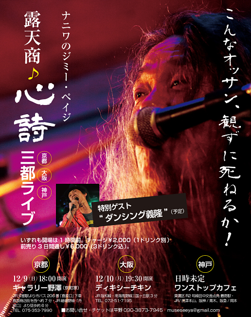 12/9(日)17:00開場 18:00開演 ●ナニワのジミー・ページ 「露天商♪心詩」 三都ライブ 【特別ゲスト】 ダンシング義隆 チャージ¥2,000(1ドリンク別) こんなオッサン、観ずに死ねるか!! と言って、ライブを企画した西岡エルトン狂象は「世界一陽気な癌患者」として 癌と戦っていましたが、 10/30、心詩を観ずに遠い世界に旅立って行きました。 心詩の「 Stairway to Heaven 天国への階段」 は彼へのレクエイム。 ダニーハサウェイの I Believe In Musicもいい! http://www.youtube.com/watch?v=8a280uSAVb8 ぜひ皆さんお越しください!!