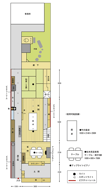 ■館内設備 ・使用範囲は表の通りに面した土間を除く母屋1階 間取り図大はこちら