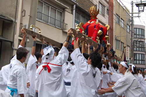 ヤスオバーガーさんの迫力に神様が故障!急遽お神輿を下ろすというハプニングが。